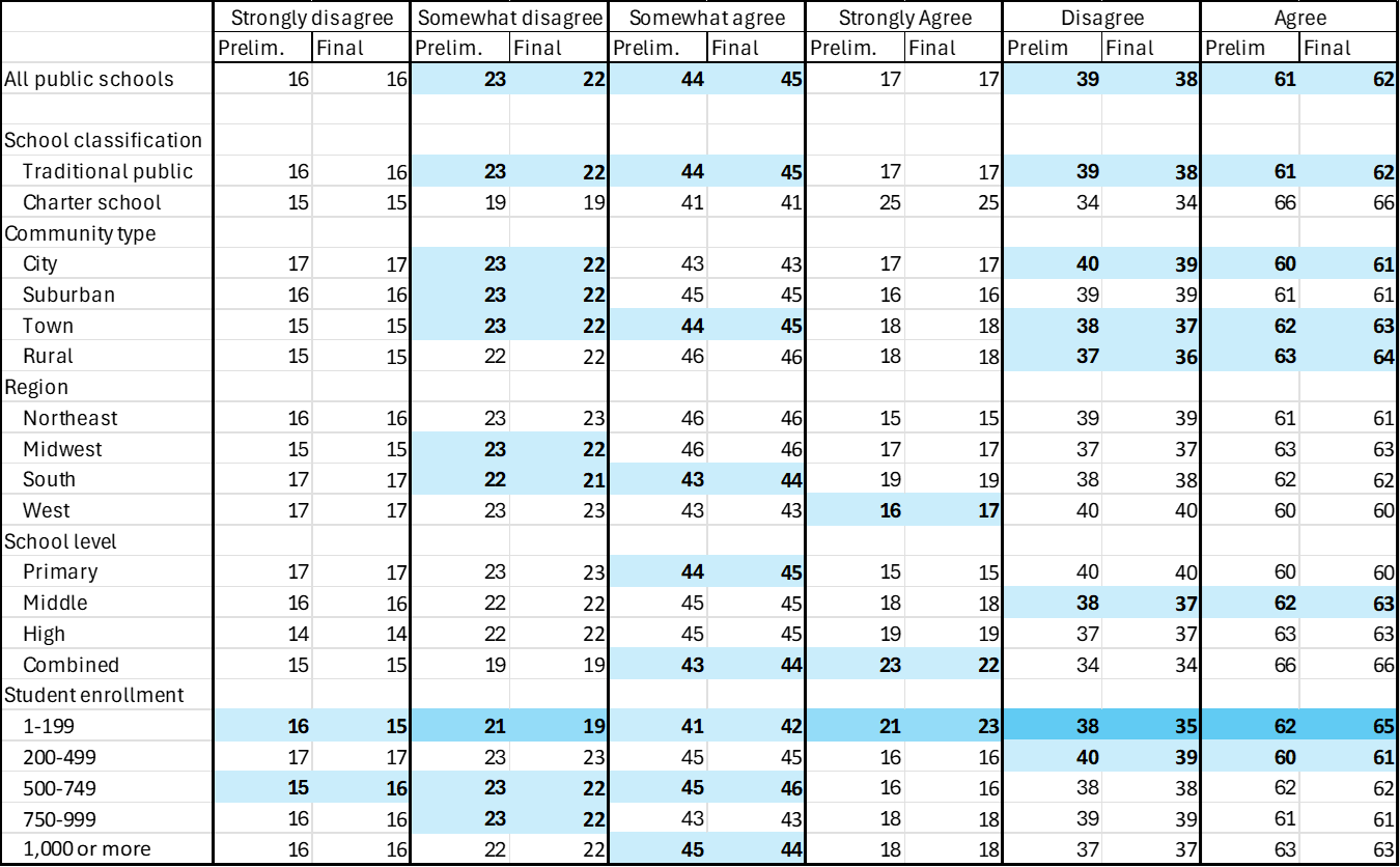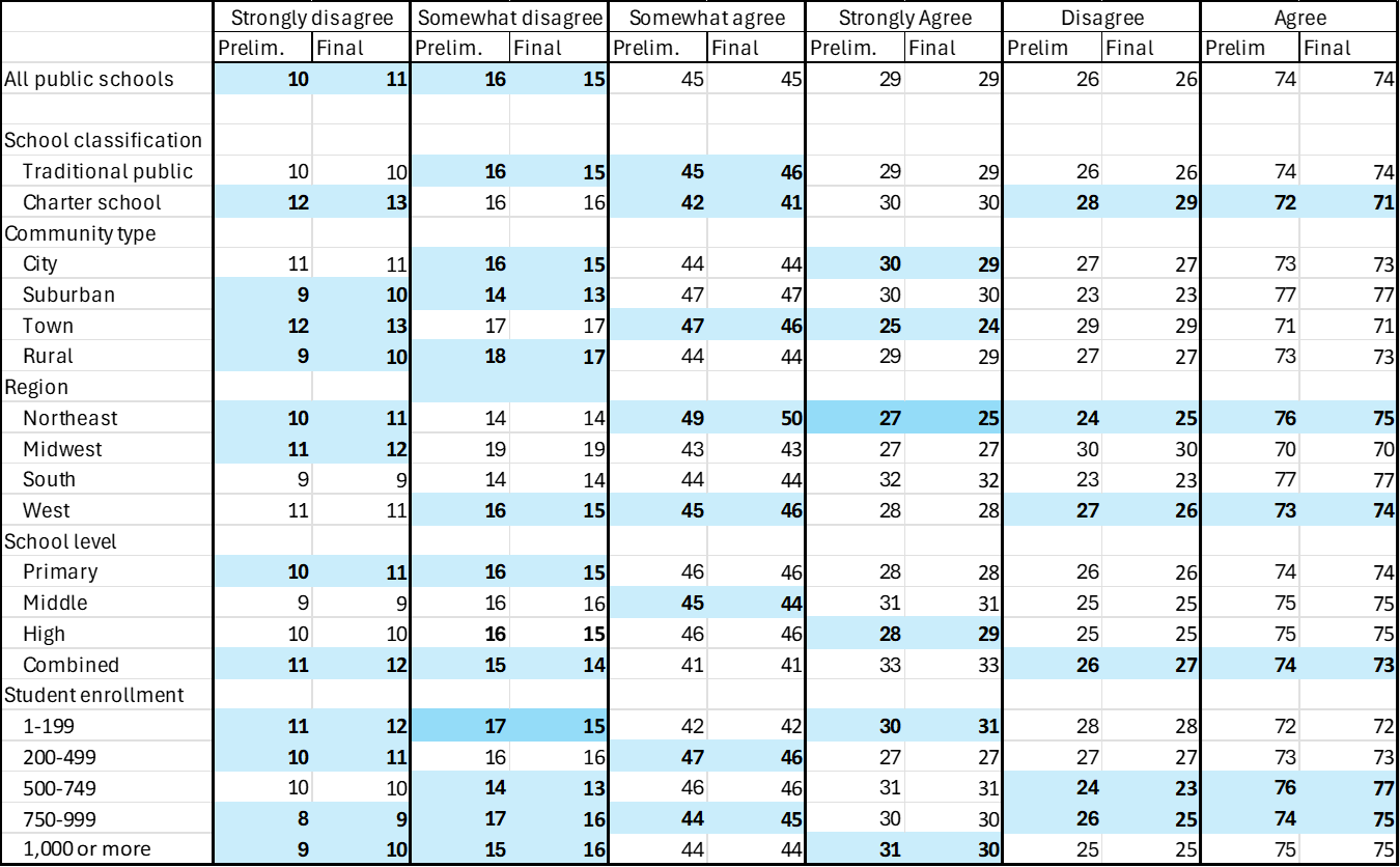 In addition to practical significance, we can look at statistical significance. One pair of estimates showed a statistically significant change between the preliminary and final estimates: among all public school teachers, there was a 1 percentage point difference in those who somewhat disagreed (23 percent and 22 percent, respectively).